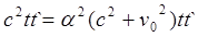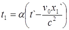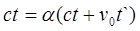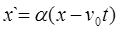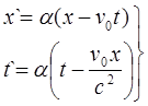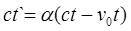 Пусть в начальный момент времени из начала отсчета вдоль оси х испускается световой сигнал. За некоторый промежуток времени t он пройдет в k: x=ct, в k`: x`=ct`. Подставим в (1) и (2):