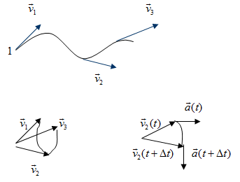 3) Ускорение - скорость изменения скорости. Пусть в момент t и t+Δt скорости равны соответственно