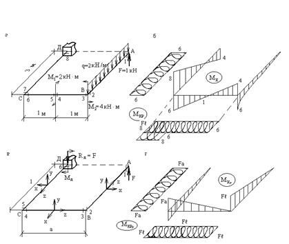 1) система располагается горизонтально, нагрузки приложены в вертикальных плоскостях (рис.15,а.,б),