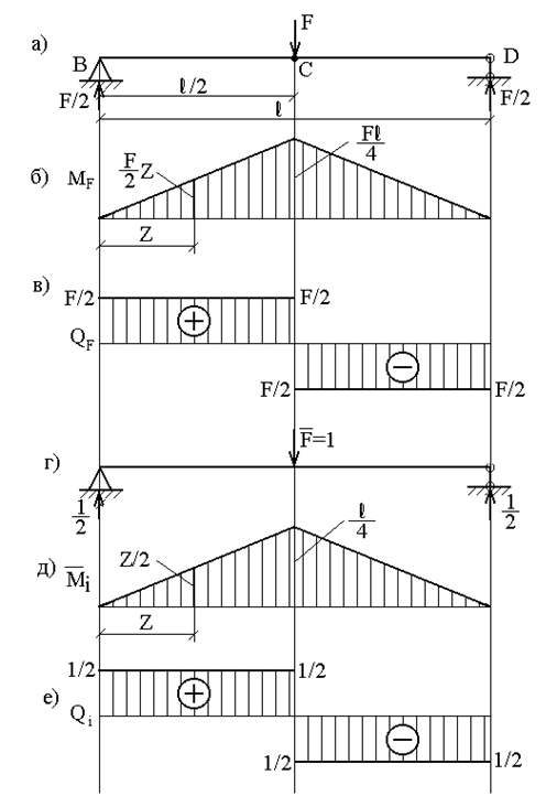 Рассмотрим два состояния балки. Первое состояние (грузовое) – при действии силы F (рис.27,а); ему соответствует эпюры изгибающих моментов