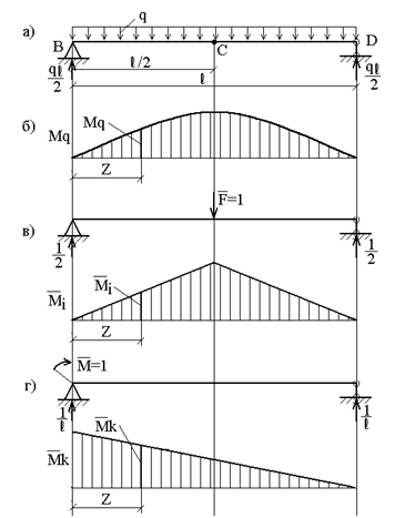 Пример 13. Определить прогиб в середине пролета и угол поворота левого опорного сечения балки, нагруженной равномерно распределенной нагрузкой (рис.26,а), методом Мора.