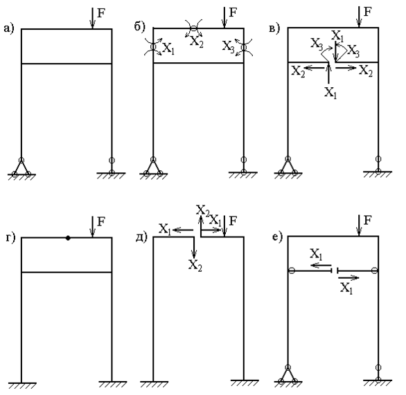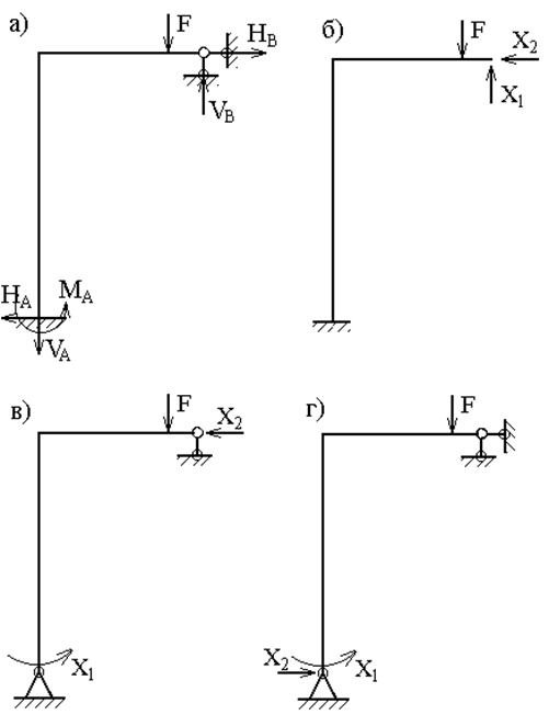 1. Отбрасывание лишних связей осуществляется полным удалением некоторых опор или их заменой опорами с меньшим числом связей. Реакции, действующие в направлениях отброшенных связей, являются лишними неизвестными. На рис.34,б, в, г показаны различные варианты эквивалентной системы, полученные этим способом для рамы (рис.34,а).
