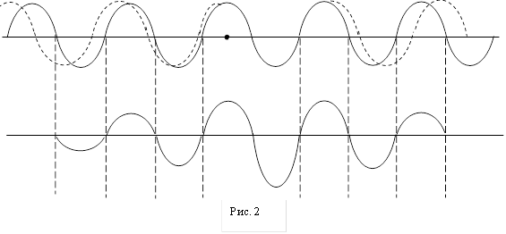 Естественный свет представляет собой сложный пакет цугов волн. В вакууме скорости для всех волн одинаковы и этот пакет имеет такую же скорость. В среде, обладающей дисперсией, световые волны распространяются с различными фазовыми скоростями, для каждой волны – своя. Пакет деформируется, и, если мы следим за максимумом амплитуды, то его скорость уже не будет совпадать с фазовыми скоростями волн, образующих этот пакет. Для простоты рассмотрения будем представлять пакет, состоящий из двух близких по частоте синусоид одинаковой амплитуды (рис. 2).