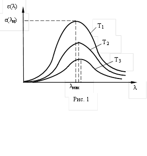 Спектр излучения абсолютного черного тела непрерывный с максимумом (рис. 1) при определенной длине волны λмакс. С понижением температуры Т1>Т2>Т3 длина волны на которую приходится максимум излучательной способности смещается в длинноволновую область. Это правило было определено Вином и носит название закона смещения Вина: