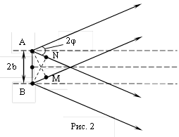 Рассмотрим условия, при которых возможно получить при этом интерференционную картину (рис. 2). Разность хода лучей Δ от крайних точек лучей А и В расходящихся под углом 2j
