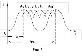 Расстояние соответствующего максимума Aк, Bк, Cк, Oк, Fк для каждой длины волны от центра О прямо пропорционально длине волны. Интерференционная картина будет различимой, если расстояние между максимумами Ак и Ак+1 не будет заполнен максимумами остальных волн интервала Δl. Таким образом, критерием неразличимости интерференционной картины будет совмещение (к+1)-го порядка максимума волны l с к-м максимумом волны l +Δl, т.е.