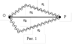 Когерентные световые волны можно получать, если разделить с помощью отражения или преломления волну, испускаемую источником на две части (рис. 1). В точке О происходит разделение волны. Первая волна проходит до точки Р, где встречаются волны, в среде с показателем преломления n1, а вторая волна в среде с показателем n2. Геометрическая длина пути первой s1, а второй s2. В т. О фаза колебания wt, а в точке Р имеем