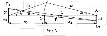 Рассмотрим протяженный предмет (рис. 3) А1В1 размером У1, находящийся на расстоянии а1 от вершины сферической поверхности О¢ и центром кривизны О. Найдем выражение для увеличения