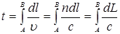 Распространение света из одной точки А в другую точку В проходит таким образом, чтобы вариация времени dt была равна нулю. Если среда оптически неоднородна, весь путь разбивают на элементарные dli участки и тогда