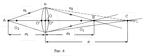Для второй поверхности изображение С является мнимым источником. Изображение этого источника после преломления на второй поверхности дает т. В на расстоянии а2=ОВ от линзы. Для этой поверхности имеем