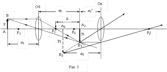 Для получения больших увеличений применяется микроскоп. В простейшем случае он состоит из двух оптических систем – объектива и окуляра, разделенных значительным расстоянием по сравнению с их фокусными расстояниями (рис. 5). Предмет АВ помещается перед передним фокусом объектива F1, вблизи него. Объектив дает увеличенное обратное изображение предмета А1В1, которое расположено вблизи переднего фокуса окуляра F2, за ним.
