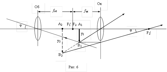 Для рассматривания удаленных предметов применяется зрительная труба или телескоп. Эта система в простейшем случае состоит из двух линз, расположенных так, что задний фокус объектива F1¢ совпадает с передним фокусом окуляра F2 (рис 6). Изображение А1В1 удаленного предмета, даваемое объективом, лежит практически в задней фокальной плоскости объектива. Длиной трубы можно пренебречь по сравнению с расстоянием до предмета. Поэтому можно считать, что невооруженным глазом предмет рассматривается под углом φ, а