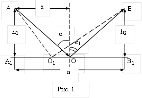 Пусть из т. А луч света падает на зеркальную поверхность и, отражаясь, попадает в т. В (рис. 1). Он может идти или по пути АОВ или АО1В. Исходя из принципа Ферма, найдем вариацию времени и приравняем нулю. Спроецируем т. А и В получим А1 и В1. А1О обозначим через х, а А1В1=а=const.