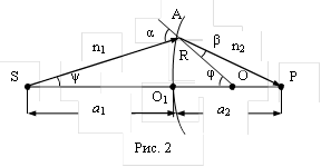 Пусть имеем сферическую поверхность радиусом кривизны R (рис. 2). S – источник, Р – изображение, ОО¢ – ось системы. Углы a и b – падения и преломления. О – центр кривизны, О¢ – вершина. Если пучок гомоцентрический (имеющий общий центр) сохраняет гомоцентричность после преломления, то каждая точка источника дает одну точку изображения. Такие изображения называются стигматическими. В силу обратимости лучей изображение можно рассматривать как источник и наоборот. В этом случае при стигматичности изображения центры пучков называются сопряженными точками оптической системы. Световые лучи и пучки также называются сопряженными.