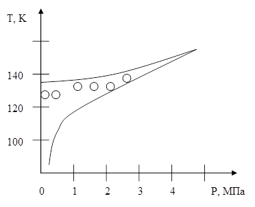 для гомогенного вскипания аргона при изобарическом нагреве в стеклянной трубке: нижняя кривая – линия насыщения (бинодаль), верхняя кривая – спинодаль.