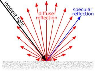 Отражение фотонов существенным образом зависит от состояния поверхности. Оно может быть зеркальным (когда угол падения равен углу отражения) и диффузным. Во втором случае свет рассеивается на шероховатостях поверхности равномерно во все стороны, тогда говорят о матовой поверхности. Диффузное рассеяние имеет место тогда, когда размер шероховатостей поверхности становится сравнимым (или большим) с длиной волны фотонов, а неровности поверхности расположены беспорядочно. В случае смешанного отражения света часть излучения отражается зеркально, а часть — диффузно. Одна и та же поверхность может быть матовой, диффузно-отражающей для видимого или ультрафиолетового излучения, но гладкой и зеркально-отражающей для инфракрасного излучения. Можно ввести долю зеркально рассеянного света. Она будет зависеть от длины волны. При диффузном рассеянии фотонов, их температура остается прежней (в отличие от газа частиц, который приобретает температуру поверхности).
