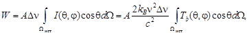 Понятие яркостной температуры имеет практическое значение лишь для источника с известной угловой структурой (по крайней мере, с известным угловым размером или известным телесным углом dW). Если же источник, как говорят, точечный и не разрешается по углу данной антенной, то мы измеряем для него лишь интеграл от интенсивности, взятый в пределах телесного угла источника. Вспомним формулу, использованную в определении интенсивности I, для потока энергии dW через элементарную площадку dA: dW=In cosq dW dA dn; пусть In мало меняется в пределах принимаемого интервала частот n ¸ n+dn. Тогда полный поток энергии, принятой от источника