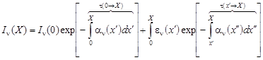 действительно является решением задачи. Здесь In(0) – интенсивность фонового излучения, приходящего на дальнюю от наблюдателя границу облака (x = 0, рис. 1.1). Интегралы под экспонентами представляют собой оптическую глубину газа в облаке, отсчитанную от разных границ. В первой экспоненте отсчет ведется от дальней границы облака (x = 0) до ближней (x = X). Таким образом, первый член характеризует поглощение фонового радиоизлучения. Второй член описывает излучение облака с учетом самопоглощения. Коэффициент излучения en под знаком интеграла означает плотность энергии, излученной в точке x = x¢. Самопоглощение учитывается экспонентой, показатель которой равен интегралу от коэффициента поглощения, вычисленному от точки излучения до границы облака x = X.