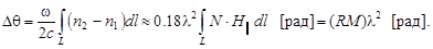 Поляризация может меняться и во время распространения волны от источника к наблюдателю. Прохождение линейно поляризованного излучения сквозь среду, содержащую свободные электроны и магнитное поле, сопровождается фарадеевским вращением плоскости поляризации (из-за различия коэффициентов преломления n1, n2 и, для обыкновенной и необыкновенной волн, см. § 2.1). Угол поворота вектора поляризации на пути L волны частоты w определяется продольной компонентой H║ магнитного поля (параллельной лучу зрения) и числом электронов на единичной площади в направлении наблюдателя: