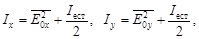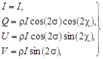 Отношение E0x/E0y и разность фаз yxy = yx – yy определяют позиционный угол эллипса c и отношение его осей p. Общая интенсивность I = Iпол + Iест равна сумме поляризованной и естественной компонент; отношение r = Iпол/I называется степенью поляризации. В качестве величин, описывающих состояние поляризации, обычно принимают параметры Стокса I, Q, U, V: