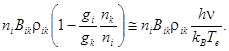 В левой части записано число переходов в единице объема за единицу времени вниз, с излучением квантов, в правой – переходы вверх, с поглощением. Здесь nk, ni – плотности атомов в состояниях k, i, rik –- плотность излучения на частоте перехода k®i. Перенесем второе слагаемое левой части в правую часть. Полное число фотонов, поглощаемых в спектральной линии, получается как разность поглощения и индуцированного излучения: