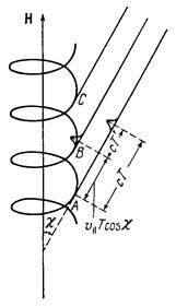 : H^ = Hsinc. Соответственно, период следования импульсов изменится вследствие эффекта Доплера за счет движения электрона вдоль силовых линий со скоростью v|| = vcosc. Электрон как бы догоняет испущенный импульс (см. рис. 2.4):