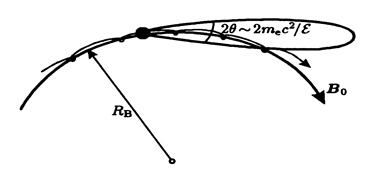 электрон вращается вокруг силовой линии магнитного поля. Вследствие релятивистского сокращения углов излучение электрона будет сосредоточено в узком конусе вокруг вектора мгновенной скорости электрона. Угол раствора конуса (в радианах)