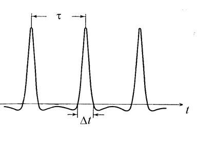 Излучение, состоящее из коротких импульсов (рис 2.3), содержит множество частотных гармоник и обладает широким спектром с максимумом вблизи частоты