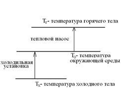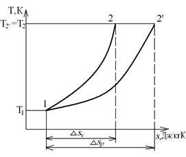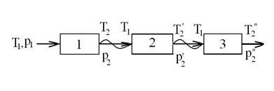 При расчете работы на привод многоступенчатого компрессора принимается, что Т2, т.е. что температура газа в конце процесса сжатия в каждой ступени одинакова, и что работа сжатия в каждой из ступеней компрессора одинакова, т.е. l1=l2=l3=lц/3, где 3 – число ступеней компрессора в рассматриваемом примере. Каждая ступень работает в одном и том же интервале температур от Т1 до Т2, как показано на следующей схеме: