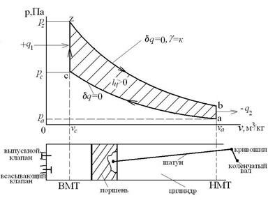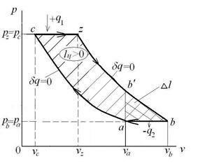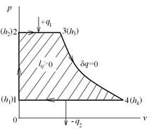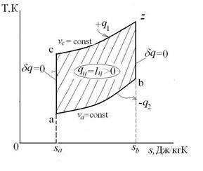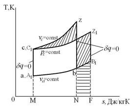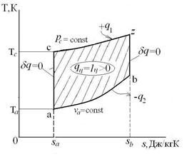 где ac –сжатие воздуха по адиабате в диффузоре или компрессоре; cz –подвод теплоты q1 по изохоре; zb – адиабатное расширение продуктов сгорания на турбине или в реактивном сопле; ba – изобарное охлаждение выхлопных газов в окружающей среде.