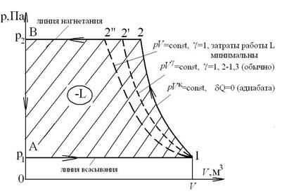 где А-1 – линия всасывания; 1-2 – процесс сжатия газа; 2-В – линия нагнетания сжатого газа в баллон; (-L) – работа, затрачиваемая на привод компрессора.