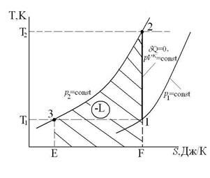 На диаграмме T-s работа, затрачиваемая на привод компрессора равна площади F23EF.