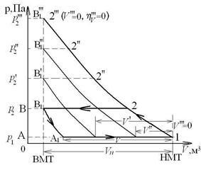 Линия А-1 и 2-В не изображают термодинамические процессы в координатах р[Па]-V3], так как количество рабочего тела на них переменно. При этом удельные параметры состояния газа (p, v, T) практически не изменяются. Основной характеристикой компрессора является степень повышения давления П=р2/р1. Для одноступенчатого компрессора П=8-12. Величина П=р2/р1 для одноступенчатого компрессора ограничивается максимальной температурой в конце процесса сжатия Т2max(3000C) из-за опасности возгорания масла и наличием вредного (мертвого) пространства между поршнем компрессора и днищем цилиндра из-за размещения в нем клапанов (всасывающего и нагнетательного), что учитывается объемным кпд компрессора , где V – фактический объем всасываемого газа. Для реальных компрессоров  (всегда). Влияние вредного пространства на степень повышения давления в одноступенчатом компрессоре проиллюстрируем следующим рисунком: