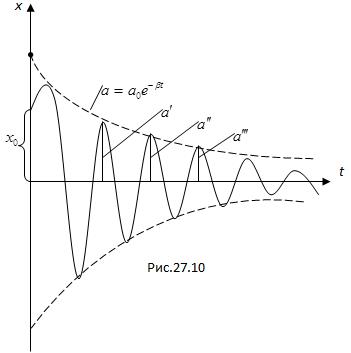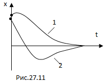 то процесс называется апериодическим (непериодическим). Выведенная из положения равновесия система, возвращается в положение равновесия, не совершая колебаний (рис.27.11, кривая 1). Кривая 2 получается в том случае, если выведенной из положения равновесия системе сообщить достаточно сильный толчок к положению равновесия.