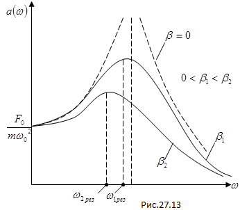 График зависимости амплитуды вынужденных колебаний от частоты изменения вынуждающей силы в соответствии с выражением (15) представлен на рис.27.13. При