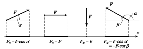 Проекцией вектора на ось называется скалярная величина, которая определяется отрезком, отсекаемым перпендикулярами, опущенными из начала и конца вектора на эту ось. Проекция вектора считается положительной (+), если направление ее совпадает с положительным направлением оси, и отрицательной (-), если проекция направлена в противоположную сторону (см. рис. 1-6).