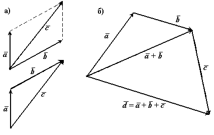 В сумме двух векторов (рис. 1-1а) начало второго вектора можно поместить в конец первого вектора, тогда сумму двух векторов можно представить как вектор, имеющий начало в начале первого вектора, а конец в конце второго вектора. Применяя это правило для суммы нескольких векторов (рис. 1-1б) получаем, что суммой нескольких векторов является вектор замыкающий ломаную линию, состоящую из слагаемых векторов.