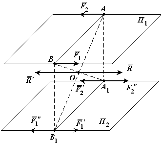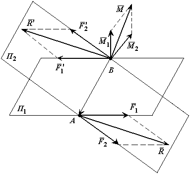 Расположим пары сил так, чтобы плечо пар было общим и располагалось на линии пересечения плоскостей.  Складываем силы, приложенные в точке А  и в точке В,             .  Получаем пару сил   .