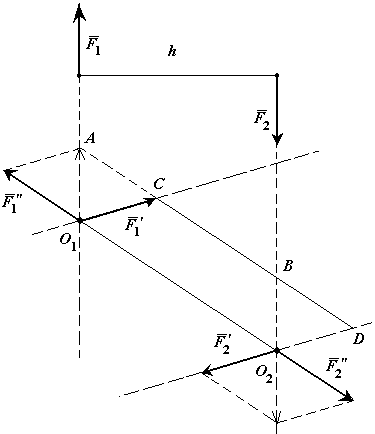 Сложим две равные и параллельные силы   и .  Их равнодействующая   параллель-на этим силам, равна их сумме и приложена посредине отрезка   в точке О.