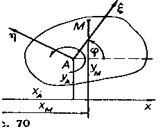 Допустим, что плоская фигура движется в неподвижной плоскости Оху. Выбрав, например, точку А плоской фигуры за полюс, неизменно свяжем с этой фигурой подвижную систему координат Аξη с началом в полюсе А (рис. 70). Для определения положения подвижной системы координат Аξη относительно неподвижной нужно знать координаты точки А (т. е. хA и уA), а также угол поворота φ вокруг полюса (т. е. угол, образованный осью Аξη с осью Ох). Следовательно, кинематические уравнения плоско-параллельного движения твердого тела имеют вид