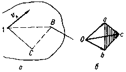 Из произвольного полюса О в выбранном масштабе откладываем вектор Оа= υА (рис. 72, б). Из точки а проводим прямую ab , перпендикулярную АВ, а из полюса – прямую, параллельную направлению искомой скорости точки В до взаимного пересечения в точке b. Вектор Оb представляет собой в выбранном масштабе скорость точки b: Оb= υВ. Вектор ab равен скорости точки В во вращательном движении вокруг точки А, т.е. ab= υАВ. Так как скорость точки С неизвестна ни по величине, ни по направлению, то составим для ее определения два уравнения, выбирая сначала за полюс точку А, а затем – точку В, и применяя формулу (ІІ.95). Получим υС= υА+ υАС, υС= υВ+ υВС , где υАС – перпендикулярна АС и υВС – перпендикулярна ВС. Тогда соответственно из точек а и b проводим прямые, перпендикулярные АС и ВС до взаимного пересечения в точке с (рис. 72, б). Вектор Ос в выбранном масштабе равен скорости точки С: Ос= υС. Соответственно ас= υАС, bc= υВС. Полученная фигура называется планом скоростей. На плане скоростей получается фигура, подобная данной, но повернутая на угол
