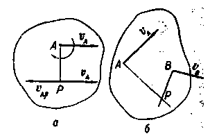 т.е. скорости точек А и В можно рассматривать как скорости в их вращательном движении вокруг мгновенного центра скоростей Р. Так как эти скорости перпендикулярны к отрезкам, соединяющим заданные точки с мгновенным центром скоростей Р, то мгновенный центр скоростей находится в точке пересечения   перпендикуляров, проведенных из начала векторов скоростей двух точек плоской фигуры,