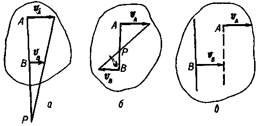 Если скорости двух точек плоской фигуры перпендикулярны к соединяющему их отрезку, то мгновенный центр скоростей находится в точке пересечения указанного отрезка с прямой, соединяющей концы векторов скоростей двух точек (рис. 74, а, б). В случае, когда скорости двух точек плоской фигуры равны и параллельны (рис. 74, в), то мгновенный центр скоростей удаляется на бесконечность, т. е. движение мгновенно поступательное.