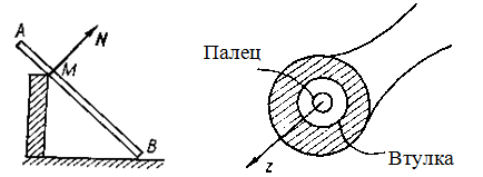 Он состоит из неподвижного цилиндрического болта (пальца), на который надевается втулка (рис. 4), имеющая цилиндрическое отверстие с диаметром, немного превышающим диаметр болта. Если тело скрепить с втулкой, то оно сможет только вращаться вокруг оси шарнира. В идеальном шарнире, в котором пренебрегают трением между поверхностями пальца и втулки, возникает только препятствие для перемещения втулки в направлении, перпендикулярном к поверхностям пальца и втулки. Поэтому реакция в идеальном шарнире направлена по нормали, т. е. по радиусу болта. В зависимости от действующих сил втулка может прижиматься к болту в любой точке. Поэтому направление реакции неподвижного цилиндрического шарнира наперед указать нельзя. Об этой реакции известно только то, что она расположена в плоскости, перпендикулярной к оси, шарнира. Схематически неподвижный шарнир изображают двумя стержнями, соединенными общим шарниром. При решении задач реакцию шарнира определяют аналитически, раскладывая ее по направлениям координатных осей. Величину проекций реакции определяют из уравнений равновесия. Аналогично поступают и в других случаях, когда направление реакции какой-то связи наперед указать нельзя.