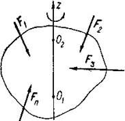 Пусть твердое тело вращается вокруг неподвижной оси под действием внешних сил F1, F2,…,Fn (рис. 114). В этом случае тело имеет одну степень свободы (k =1) и за обобщенную координату примем угол поворота (q=φ).