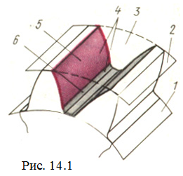 Боковая поверхность состоит из главной (5) и переходной (6) поверхностей. Главная поверхность - это та часть боковой поверхности зуба, которая, взаимодействуя с главной поверхностью другого зуба, обеспечивает заданное передаточное отношение. Переходная поверхность соединяет главную поверхность с поверхностью впадин.