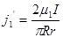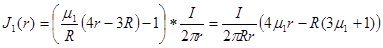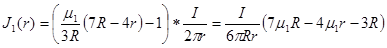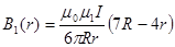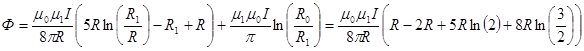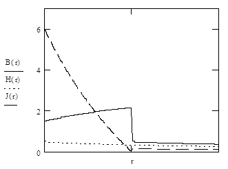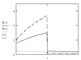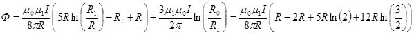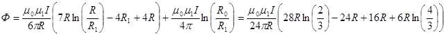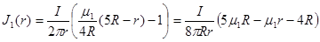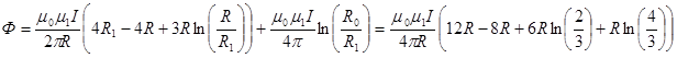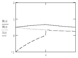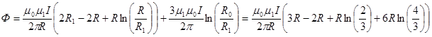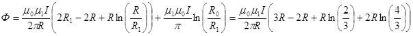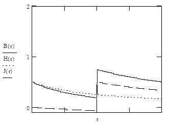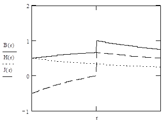 По коаксиальному кабелю, радиусы внешнего и внутреннего проводника которого равны R0 и R соответственно, протекает ток I. Пространство между проводниками заполнено магнетиком, магнитная проницаемость которого меняется по линейному закону от значения m1 до m2 в интервале радиусов от R до R1, и m3=const в интервале радиусов от R1 до R0 (R1=(R0+R)/2). Построить графически распределения модулей векторов индукции B и напряжённости H магнитного поля, а также вектора намагниченности J в зависимости от r на интервале от R до R0. Определить поверхностную плотность токов намагничивания i'п на внутренней и внешней поверхностях магнетика и распределение объёмной плотности токов намагничивания i'об(r). Определить индуктивность единицы длины кабеля.