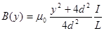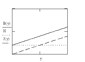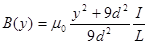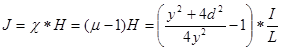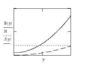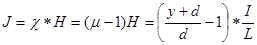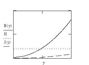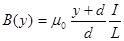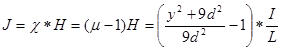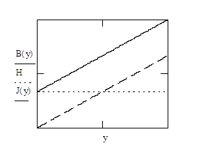 Два плоских проводника с токами I, текущими в противоположных направлениях, разделены слоем магнетика толщиной d. Ширина проводников равна L (L>>d). Магнитная проницаемость m магнетика меняется в направлении оси y по закону m=f(y). Построить графически распределения модулей векторов индукции B и напряжённости H магнитного поля, а также вектора намагниченности J в зависимости от y в интервале значений от 0 до d. Определить поверхностную плотность токов намагничивания i'п на верхней и нижней поверхностях магнетика и распределение объёмной плотности токов намагничивания i'об(y). Определить индуктивность единицы длины этой двухполосной линии.
