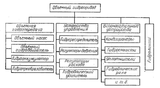Объемный гидропривод состоит из гидропередачи, устройств управления, вспомогательных устройств и гидролиний (рис.1.1).