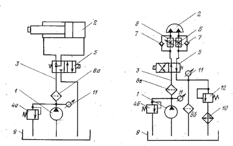 Насосом 1 рабочая жидкость подается в напорную гидролинию 3 и далее через распределитель 5 к гидродвигателю 2. При одном положении гидрораспределителя совершается рабочий ход гидродвигателя, а при другом положении - холостой. Из гидродвигателя жидкость через распределитель поступает в сливную гидролинию и далее или в гидробак 9, или во всасывающую гидролинию насоса (в гидроприводах с замкнутой схемой циркуляции рабочей жидкости, см. рис.1.2, а). В резервуаре жидкость охлаждается и снова поступает в гидросистему. Надежная работа гидропривода возможна только при соответствующей очистке рабочей жидкости фильтрами 8.